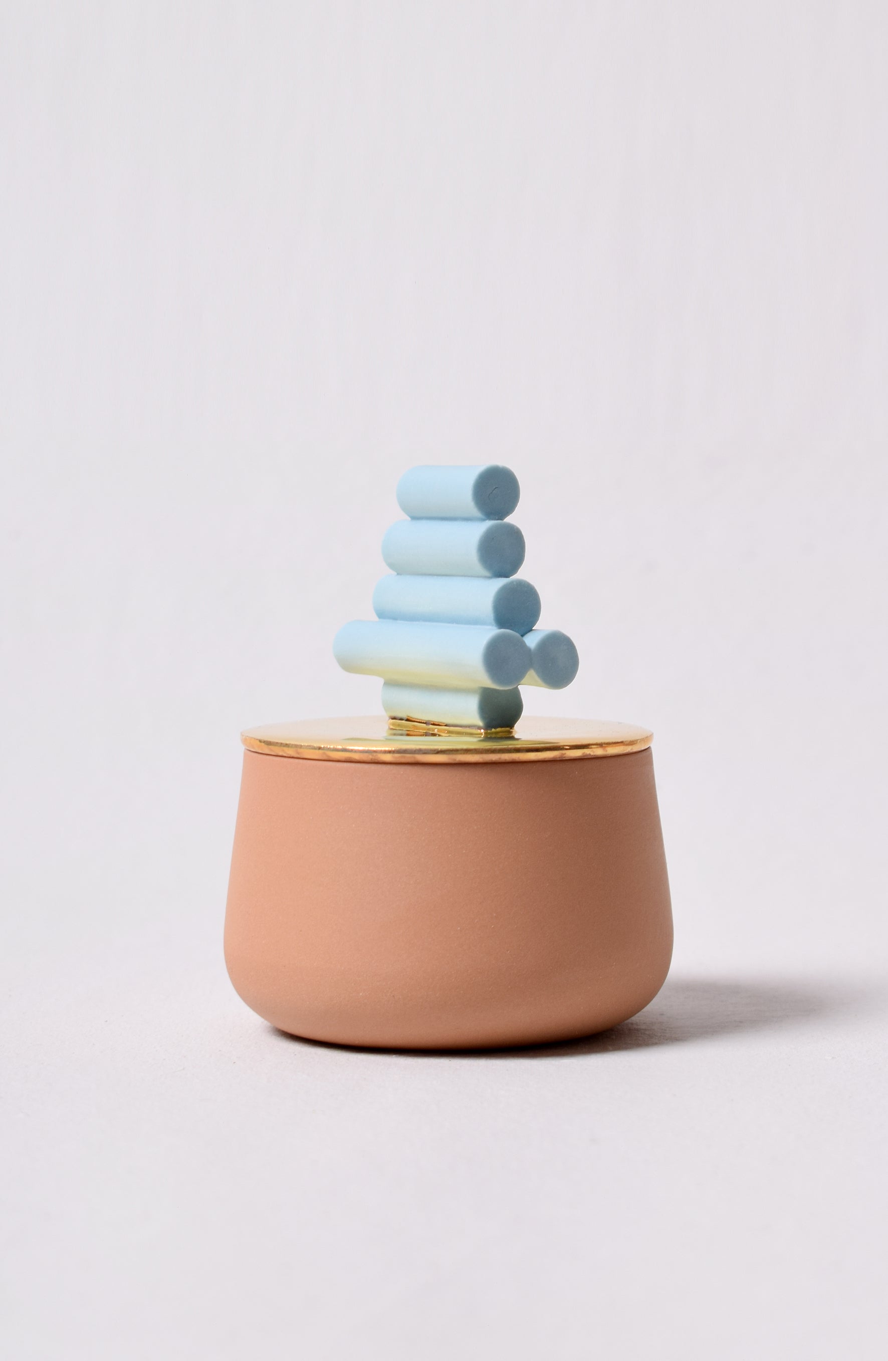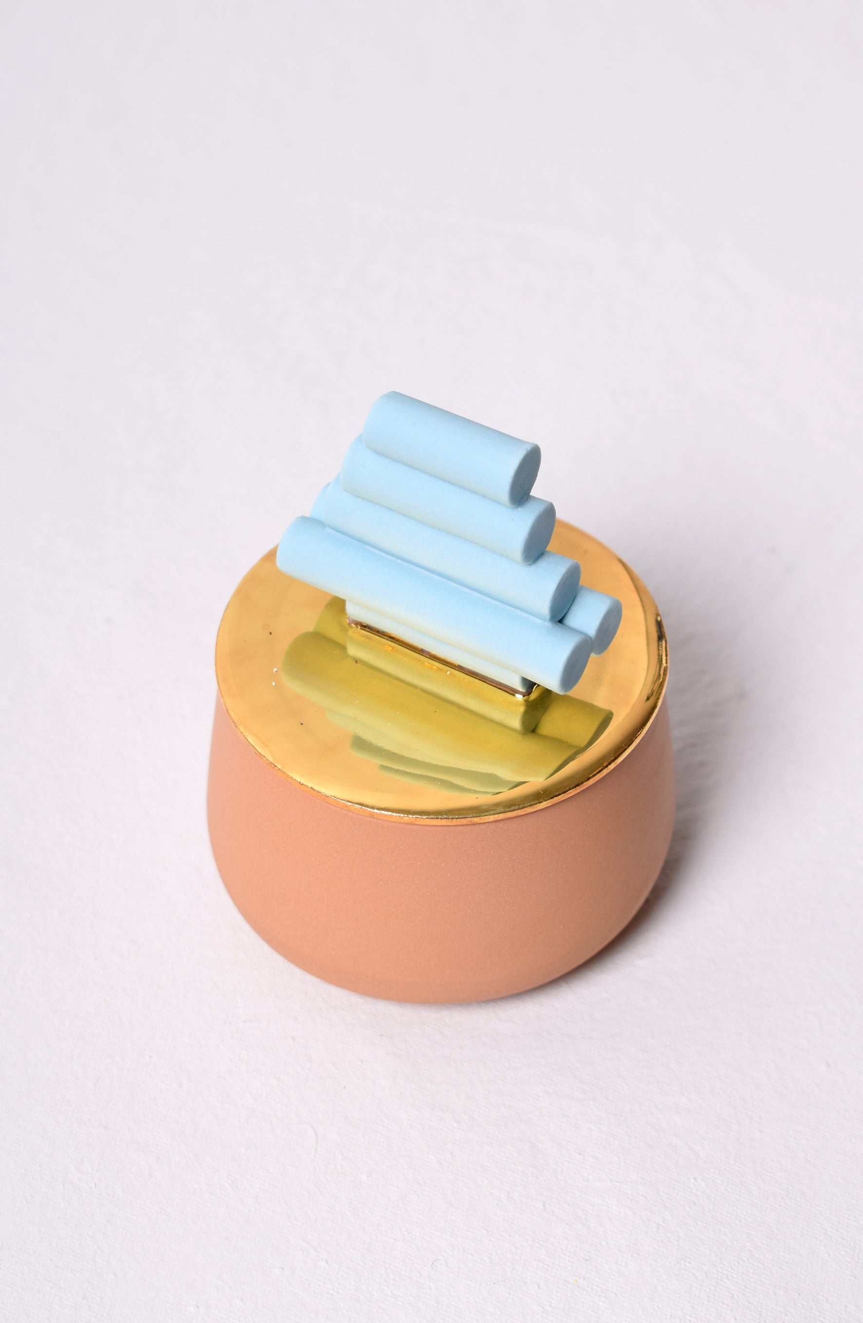 Sculptural Series No. 9/14 on pastellisävyinen posliinirasia, jonka päällä on taivaansininen veistoksellinen elementti ja kannessa (aito) kultainen pinnoite. Käsintehty studiollani Helsingissä.